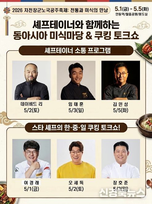 미식의 깊이를 더하는 ‘스타 셰프의 한․중․일 쿠킹 토크쇼’도 함께 진행된다. 이번 쿠킹 토크쇼에는 5월 1일 여경래 셰프(중식), 5월 2일 오세득 셰프(한식), 5월 3일 장호준 셰프(일식)가 참여해 안동에서 나는 식재료와 닭을 활용한 한․중․일 음식을 선보이고, 시식 체험․현장 질의응답․셰프 사인 이벤트 등을 진행해 미식 콘텐츠의 완성도를 높일 계획이다.