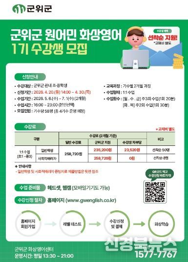 [신경북뉴스] 군위군은 관내 초·중학생의 영어 능력 향상과 사교육비 부담 완화를 위해 ‘1:1 원어민 화상영어’ 프로그램 1기 수강생을 4월 30일까지 선착순 모집한다고 밝혔다.