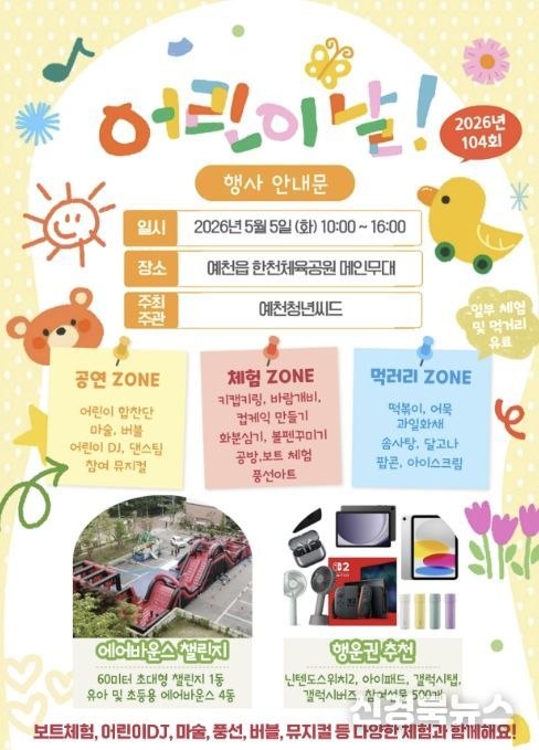 [신경북뉴스] 예천군은 제104회 어린이날을 맞아 오는 5월 5일 오전 10시부터 오후 4시까지 한천체육공원 메인무대 일원에서 ‘2026년 제104회 예천군 어린이날 기념행사’를 개최한다.