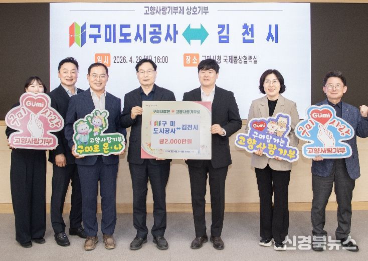 [신경북뉴스] 구미시는 4월 28일 구미도시공사와 김천시가 고향사랑기부제 활성화와 이웃 지역 간 상생 발전을 위해 고향사랑기부금 2,000만원을 상호기부했다고 밝혔다.