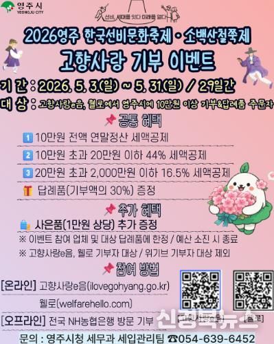 [신경북뉴스] 영주시는 5월 개최되는 '2026 영주 한국선비문화축제'와 '소백산철쭉제'를 맞아 고향사랑기부제 참여 확대를 위한 특별 이벤트를 운영한다.