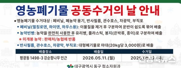 [신경북뉴스] 대구 동구청은 5월 27일까지 농촌지역에 영농폐기물 공동수거의 날을 지정해 운영한다.
