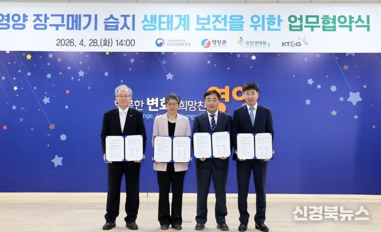 [신경북뉴스] 영양군은 대구지방환경청, 국립생태원, ㈜KT&G와 4월 28일, 영양 장구메기 습지 생태계 보전을 위한 업무협약을 체결했다.