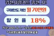 [신경북뉴스] 김천시는 오는 12월 한 달 동안 김천사랑상품권을 18% 특별 할인 판매한다고 28일 밝혔다. 시는 이번 특별 할인판매로 연말 소비 촉진을 비롯해 침체된 지역 상권 에 활력을 불어넣고, 지역경제 회복에도 긍정적인 영향을 미칠 것으로 기대하고 있다. 특히, 시는 12월 한 달 동안 진행되는 이번 특별 할인판매 기간에 한하여 개인 구매 한도를 월 70만 원으로 확대해 더 많은 시민이 혜택을 누릴 수 있도록 할 방침이다. 이번 연말 특별 할인판매로 연말 선물·장보기 등 가계 지출이 늘어나는 시기에 실질적인 가계 부담을 덜어주는 동시에 지역 내 소비 확대로 이어져 지역 상권 전반에 크게 도움이 될 전망이다. 다만, 예산 소진 시 특별 할인판매 기간 중이라도 조기 종료될 수 있으니, 혜택을 놓치지 않으려면 빠른 참여가 필요하다. 김천시 관계자는 “연말을 맞아 진행하는 김천사랑상품권 특별 할인판매가 상권 활성화와 지역경제에 실질적인 보탬이 되기를 바라며, 많은 시민이 혜택을 누리고, 조금 더 따뜻한 연말을 보내는 데 도움이 됐으면 한다.”라고 말했다.