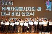 [신경북뉴스] 대구광역시는 3월 23일 오후 2시, iM뱅크 제2본점에서 대구광역시자원봉사센터와 함께 ‘2026년 세계자원봉사자의 해 대구비전 선포식’을 성황리에 개최했다. 이번 선포식은 유엔(UN)이 2001년 이후 25년 만에 다시 지정한 ‘2026 세계자원봉사자의 해’를 맞아 대구만의 차별화된 자원봉사 모델을 구축하고 새로운 도약을 선언하기 위해 마련됐다. 대구시는 전국 최초로 6년 연속 자원봉사 우수도시로 선정되는 등 자원봉사 선도도시로서의 위상을 이어가고 있다. 특히 올해는 전국 최초로 설립된 대구시자원봉사센터가 개소 30주년을 맞는 뜻깊은 해로, 지난 성과를 돌아보고 미래 30년의 청사진을 제시하는 데 중점을 뒀다. 이날 행사에는 안중곤 대구시 행정국장, 윤영애 대구시의회 기획행정위원회 위원장, 홍정우 행정안전부 민간협력공동체과장을 비롯해 한국중앙자원봉사센터 등 100여 개 유관기관 관계자와 자원봉사자 350여 명이 참석했다. 행사는 홍보영상 상영을 시작으로 ▲개회식 ▲비전 선언문 낭독 ▲선포 퍼포먼스 ▲축하공연 순으로 진행됐다. 참석자들은 선언문을 함께 낭독하며 자원봉사의 사회적 가치를