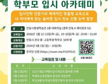 [신경북뉴스] 안동시는 자녀의 대학 입시를 준비하는 학부모들을 대상으로 맞춤형 전략을 제공하는 ‘학부모 입시 아카데미’를 운영한다. 이 프로그램은 안동시 내 중·고등학생 학부모 50명을 모집해, 변화하는 대입 환경에 효과적으로 대응할 수 있도록 지원한다. 최근 고교학점제 도입과 대입 제도 변화로 인해 입시 준비가 복잡해진 상황에서, 안동시는 입시 전문가의 체계적인 교육을 통해 학부모들이 정보 격차를 줄이고 자녀의 진학 준비에 실질적인 도움을 받을 수 있도록 이번 교육을 마련했다. 교육은 3월 12일, 13일, 19일, 20일 등 총 4일간 안동시 평생학습관 3층 대회의실에서 평일 저녁 17시부터 19시까지 진행된다. 주요 내용으로는 2027학년도 대입 제도 이해, 학생부교과전형 및 학생부종합전형 분석과 지원 전략, 논술전형 및 정시 지원 전략 등이 포함된다. 각 전형별 평가 요소와 최근 입시 동향을 다루며, 학부모가 자녀의 학교생활 관리와 지원 전략 수립에 필요한 정보를 제공한다. 참가를 희망하는 학부모는 3월 1일부터 10일까지 온라인으로 신청할 수 있다. 안동시 관계자는 "입시는 장기적인 준비가 필요한 만큼 학부모의 이해와 역할이 매우 중요하다"며 "이번
