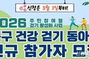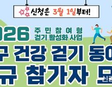 [신경북뉴스] 대구 북구보건소 강북보건지소는 3월 1일부터 31일까지 ‘2026년 주민 참여형 건강 걷기 동아리’ 신규 참여자를 선착순 모집한다고 24일 밝혔다. 생활터 중심의 건강 공동체를 발굴하고, 주민이 주도하는 걷기 활동을 통해 건강생활 실천 문화를 정착시키기 위한 취지다. 모집 대상은 20세 이상 북구 주민 및 북구 소재 직장 재직자 160여 명이다. 3~5인 1팀으로 동아리를 구성하여, QR코드를 통한 온라인 신청 또는 대표자 1인이 강북보건지소 방문 신청하면 된다. 선정된 참여자에게는 사전·사후 기초검사를 통한 건강위험요인 및 건강행태 변화 모니터링, 걷기지도자 양성 교육, 걷기 실천 달성자 및 우수활동자 인센티브 등 다양한 혜택을 지원할 예정이다. 자세한 사항은 강북보건지소 건강사업팀으로 문의하면 된다.