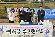 [신경북뉴스] 한국부인회 고령지회(회장 박경숙)는 11월 13일 오전 7시부터 지역 수능 시험장인 대가야고등학교 정문에서 수험생과 학부모들을 위하여 따뜻한 음료과 간식 꾸러미를 전달하며 수험생 격려 응원 봉사를 펼쳤다. 이날 한국부인회 회원들은 이른 새벽부터 정성껏 준비한 음료와 간식 꾸러미를 수험생 한 명 한 명에게 응원 메시지와 함께 건네며 그동안의 노력이 좋은 결실로 이어지기를 기원했다. 박경숙 한국부인회 고령지회장은 “그동안 쌓아온 노력과 열정이 오늘 좋은 결실로 이어지길 바라며, 긴장하지 말고 평소 실력을 충분히 발휘하길 바란다.”고 격려의 말을 전했다. 고령군(군수 이남철)은 “이른 새벽부터 수험생들을 응원하기 위해 정성을 다해 봉사해주신 한국부인회 고령군지회 회원 여러분께 깊은 감사를 드리며, 지역의 학생들이 그동안 쏟은 노력과 열정이 오늘 좋은 결실로 이어지길 진심으로 바란다.”고 말했다. 한국부인회는 여성 지위의 향상과 사회참여의 확대, 자원봉사활동을 통하여 복지사회 실현을 목적으로 설립된 최초의 여성단체이며, 한국부인회 고령지회는 1978년 발족되어 복지시설 목욕봉사, 막대인형극