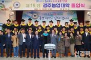 [신경북뉴스] 경주시는 12일 농업인회관에서 ‘제19회 경주농업대학 졸업식’을 열고, 지역 농업의 지속가능한 발전을 이끌 100명의 전문농업인을 새롭게 배출했다. 이날 졸업식에는 졸업생, 가족, 지도교수, 농업관계자 등 150여 명이 참석한 가운데, 올 3월 입학한 교육생들이 ‘귀농귀촌과정’, ‘스마트농업과정’, ‘치유농업과정’ 등 3개 과정을 이수하고 농업 현장의 전문성과 경쟁력을 갖춘 인재로 거듭났다. 졸업생 중에서는 △시장 표창 6명 △농촌진흥청장 표창 2명 △성적우수자 표창 11명 △개근상 28명 등 총 47명이 우수한 성과를 인정받아 수상의 영예를 안았다. 한편, 경주농업대학은 2007년 개교 이래 총 65개 과정을 운영하며 2,596명의 졸업생을 배출했다. 시는 급변하는 농업환경에 대응하기 위해 실무 중심의 교육과정을 지속적으로 개편‧운영하며, 지역농업의 경쟁력 강화와 전문농업인 양성에 힘쓰고 있다. 주낙영 경주시장은 “모든 학사 일정을 성실히 마친 졸업생 여러분께 진심으로 축하의 말씀을 드린다”며, “농업대학에서 배운 지식과 경험을 바탕으로 경주 농업의 미래를 선도하는 주역