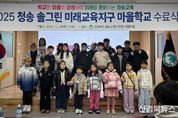 [신경북뉴스] 경상북도청송교육지원청은 12월 20일 청송교육지원청 대회의실에서 3개 마을학교 학생, 마을 교사, 학부모 등 약 100명이 참석한 가운데 2025년 청송 솔그린 미래교육지구 마을학교 수료식을 개최했다. 청송 솔그린 미래교육지구는 지역사회와 학교가 함께 교육력을 높여 평생교육까지 확장하여 배움이 있는 지속가능한 교육생태계를 조성하고자 경상북도청송교육지원청, 청송군청, 학교, 마을이 협력하고 연대하는 공동체로 2025년에는‘작은 학교 도담’,‘참보배 학교’,‘마실애 학교’3개의 마을학교가 청송 솔그린 미래교육지구 사업에 참여했다. 이날 수료식은 마을학교의 성과를 공유하고 지역사회의 학교 교육 참여를 확대하고, 마을과 함께 협력하는 돌봄을 활성화하기 위하여 마련됐다. 특히 올해는 미래교육지구 운영 3년 차를 맞아 3개 마을학교가 일 년 동안 활동한 모습을 영상으로 제작하여 감상하고 또한 학생들이 준비한 활동 소감을 마을학교별 대표 학생이 발표했다. 특히 진보초등학교 5학년 장○서 학생은 ‘1년간 주말과 방학 중에 열심히 지도하고 돌봐주신 마을학교 선생님들에게 감사하다.’고 말하여 참석한 사